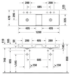 Duravit Happy D.2 – Doppelwaschtisch 1200×505 Mm, Mit Überlauf, 2 Hahnlöcher, Weiß 2318120024